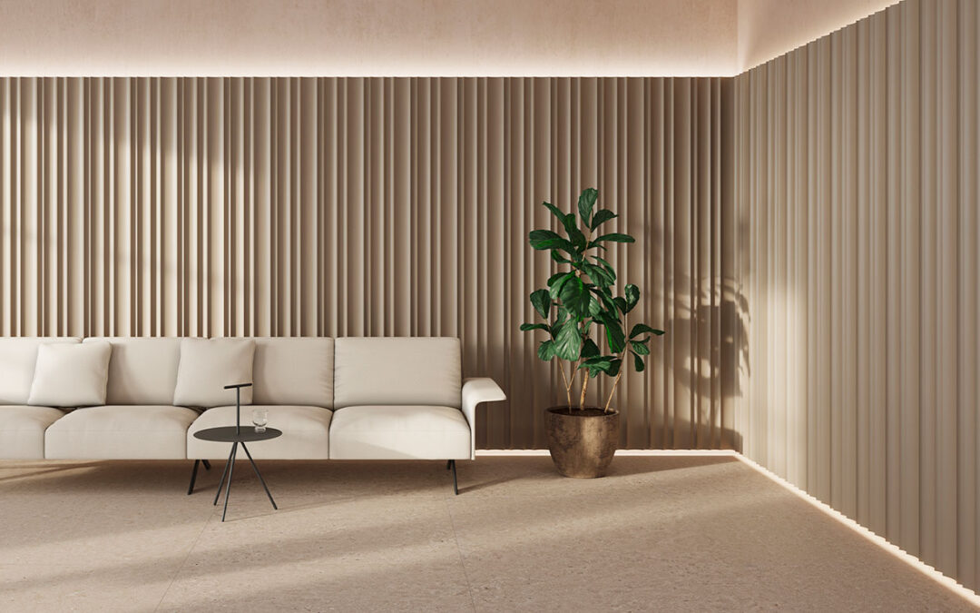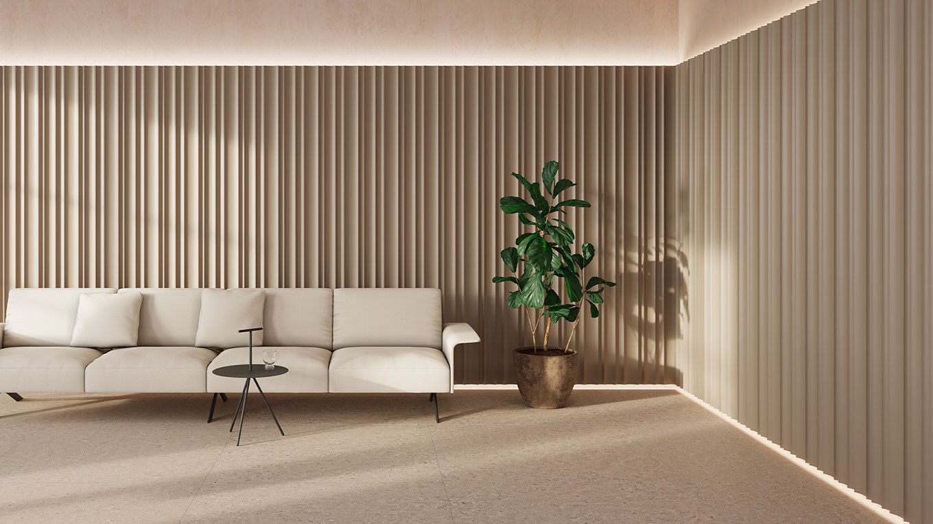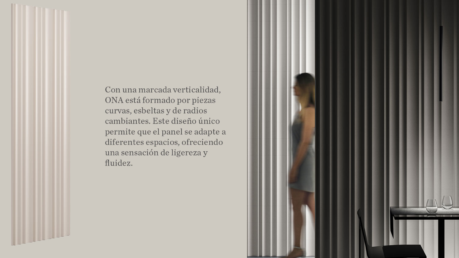 El panel ONA se inspira en los trazos que el viento dibuja sobre la superficie del agua o la arena. Su geometría fluida y natural se convierte en una representación moderna de la naturaleza, creando un ritmo visual mediante la repetición de formas sutiles.
